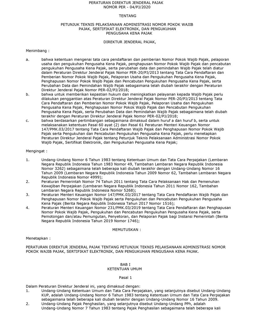 PERATURAN DIREKTUR JENDERAL PAJAK NOMOR PER - 04/PJ/2020