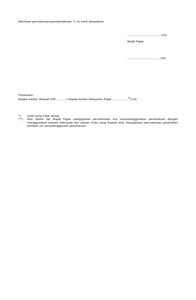 dapat mengajukan permohonan menyelenggarakan pembukuan atau pencatatan dengan menggunakan bahasa Indonesia dan satuan mata uang Rupiah kepada Kepala Kantor Wilayah Direktorat Jenderal Pajak yang wilayah kerjanya meliputi Kantor Pelayanan Pajak tempat Wajib Pajak terdaftar atau unit lain yang ditetapkan oleh Direktur Jenderal Pajak secara elektronik melalui laman Direktorat Jenderal Pajak atau saluran lain yang terintegrasi dengan sistem Direktorat Jenderal Pajak sesuai dengan contoh format tercantum dalam Lampiran huruf A.