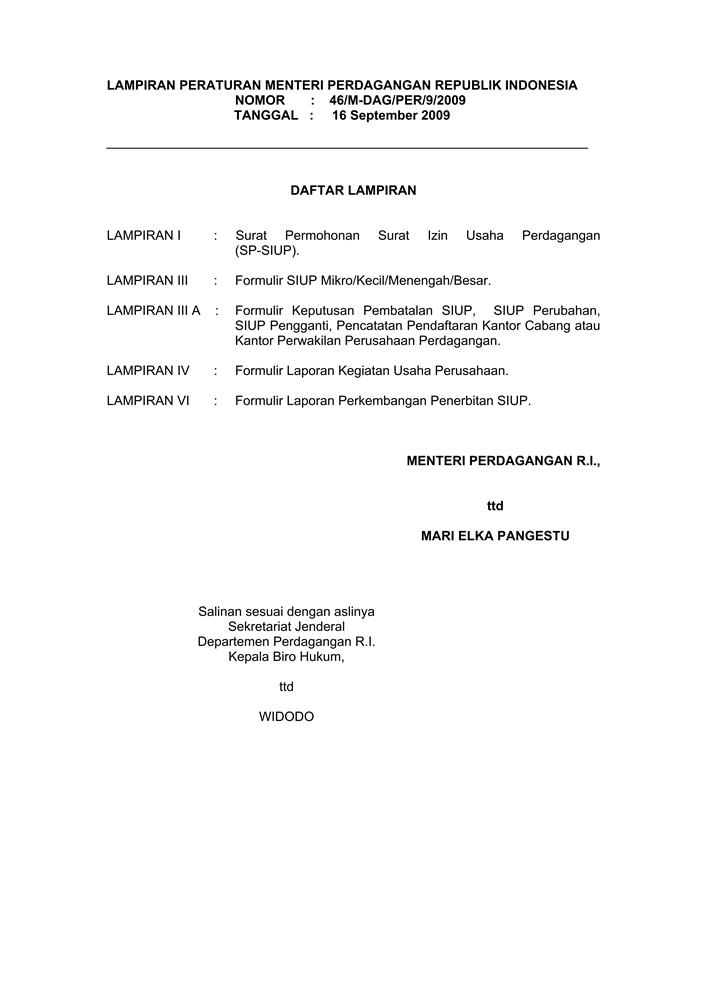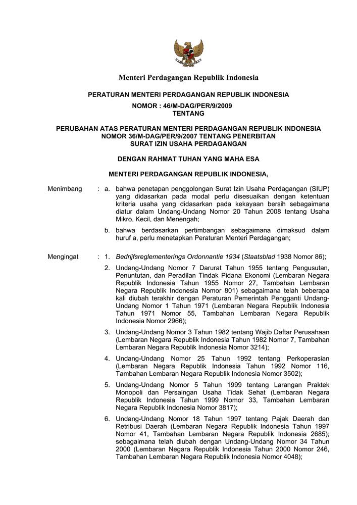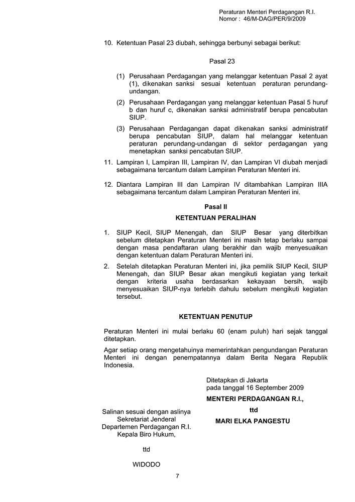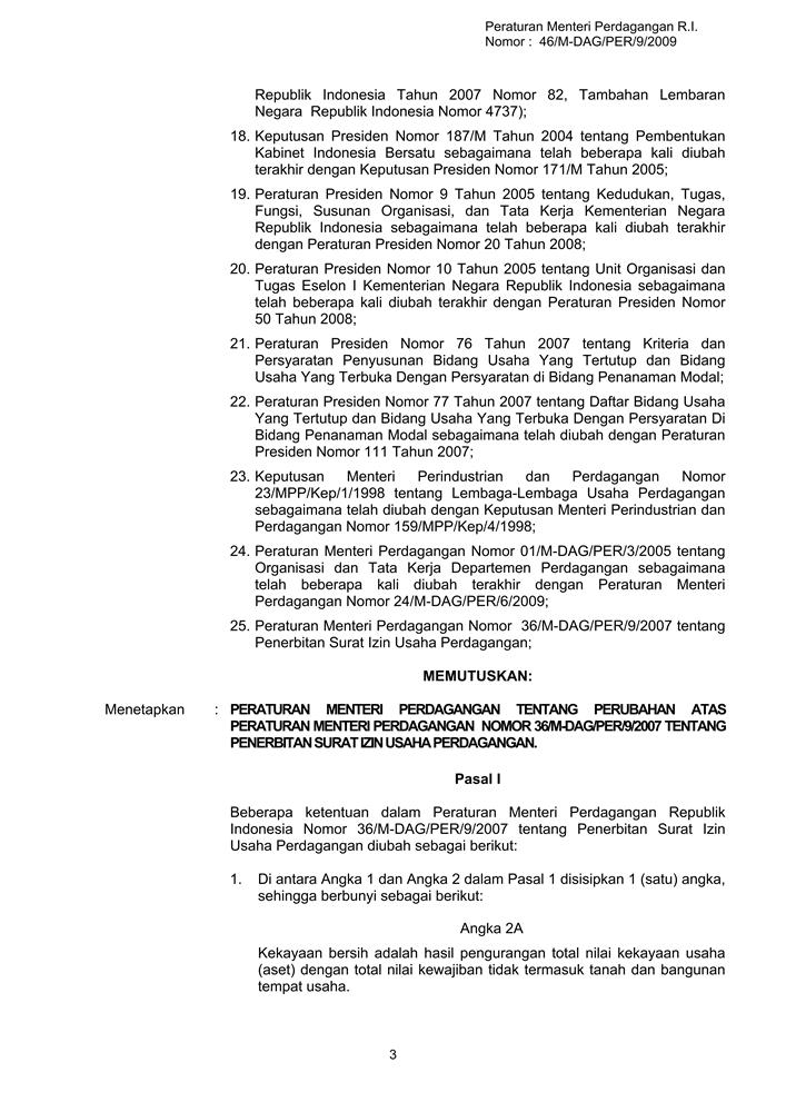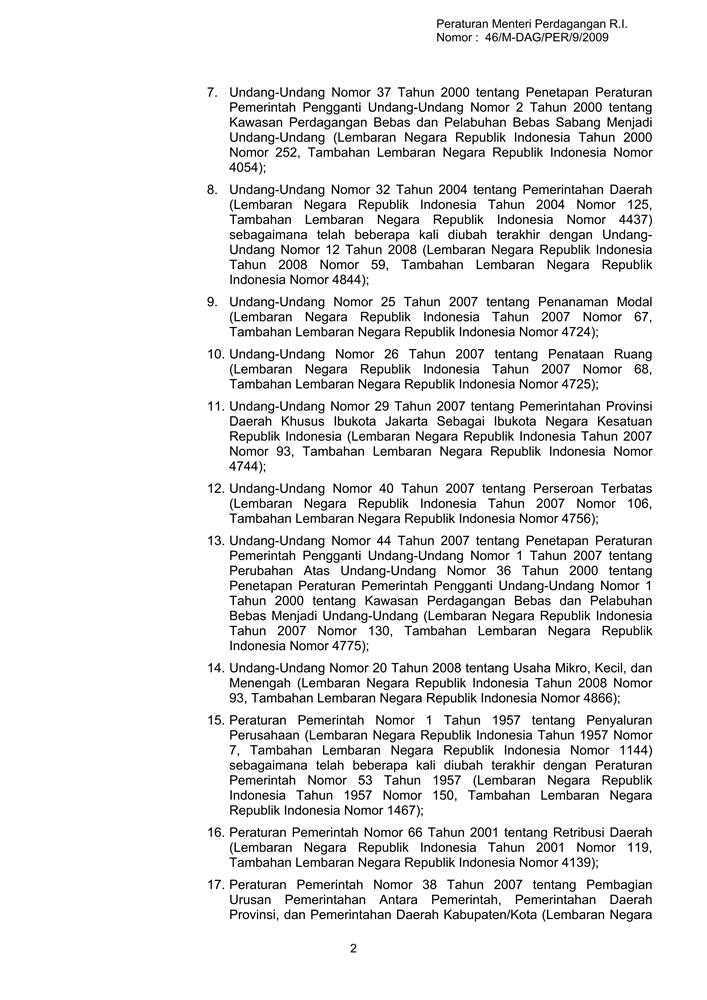 PERATURAN MENTERI PERDAGANGAN REPUBLIK INDONESIA NOMOR 46/M-DAG/PER/9/2009