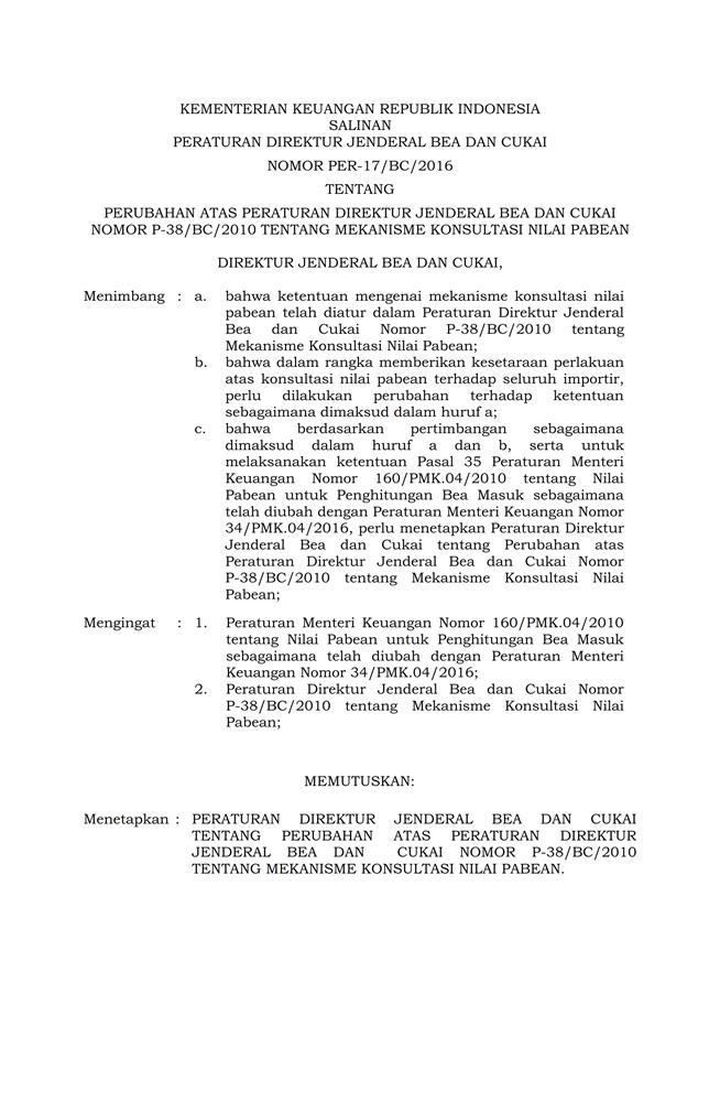 PERATURAN DIREKTUR JENDERAL BEA DAN CUKAI NOMOR 17/BC/2016