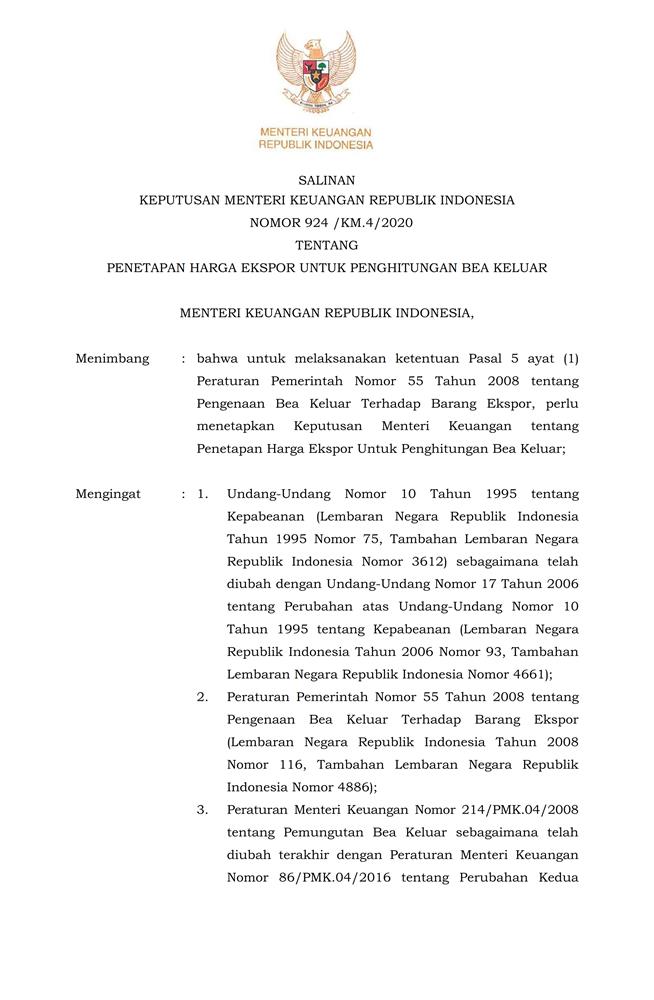 KEPUTUSAN MENTERI KEUANGAN REPUBLIK INDONESIA NOMOR 924/KM.04/2020