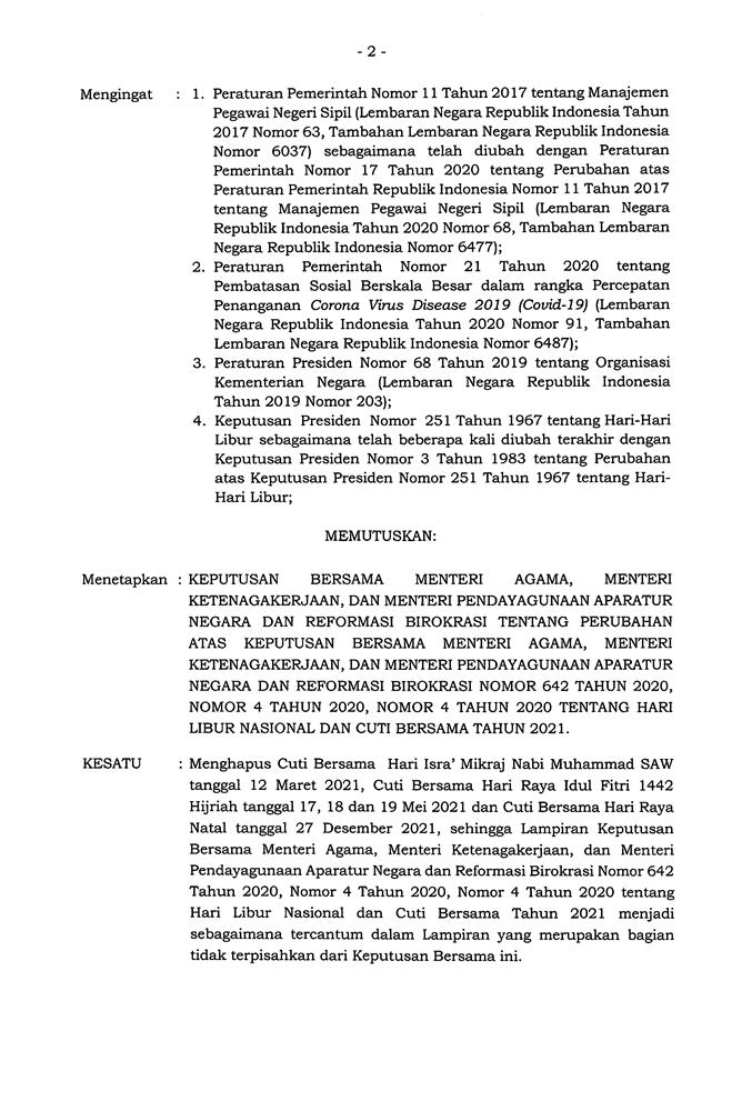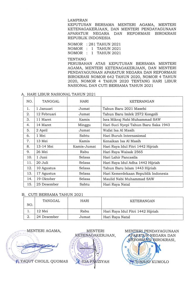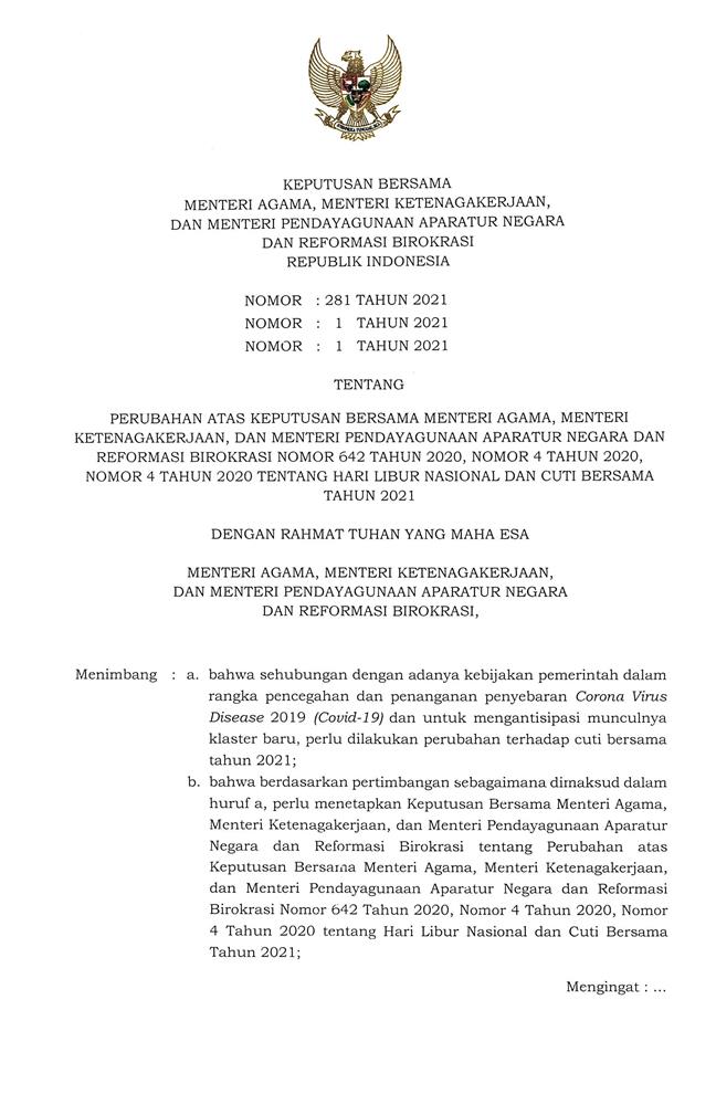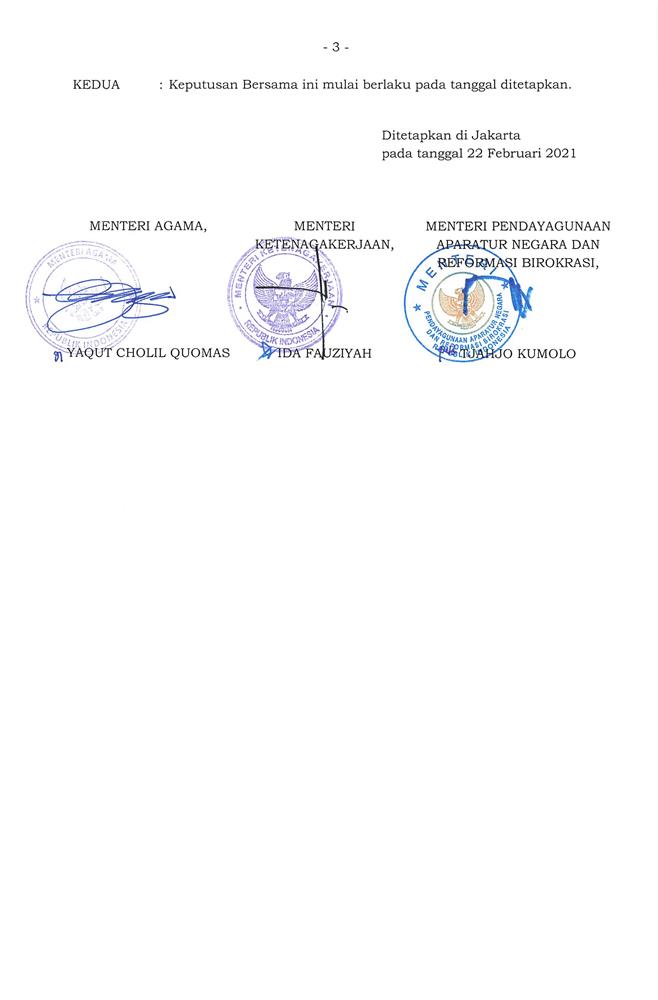 KEPUTUSAN BERSAMA MENTERI AGAMA, MENTERI KETENAGAKERJAAN, DAN MENTERI PENDAYAGUNAAN APARATUR NEGARA DAN REFORMASI BIROKRASI REPUBLIK INDONESIA NOMOR 281 TAHUN 2021 NOMOR 1 TAHUN 2021 NOMOR 1 TAHUN 2021
