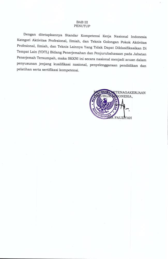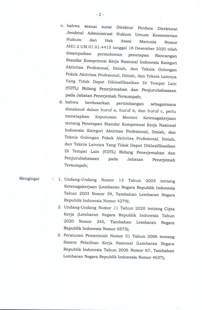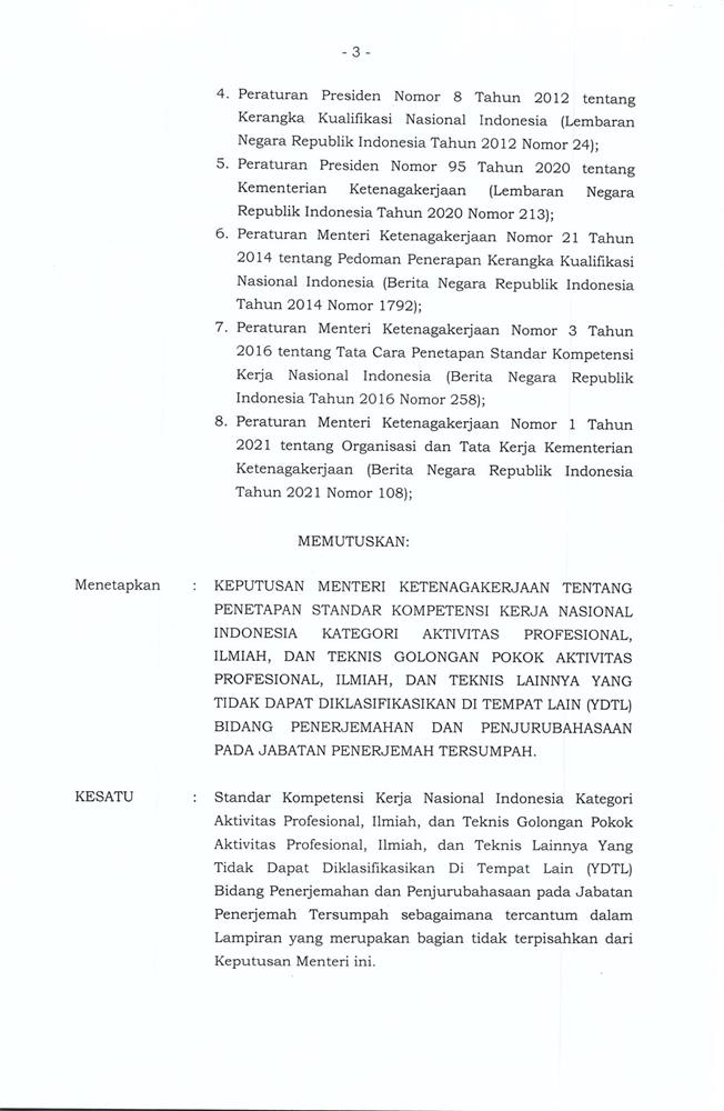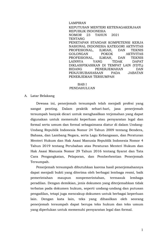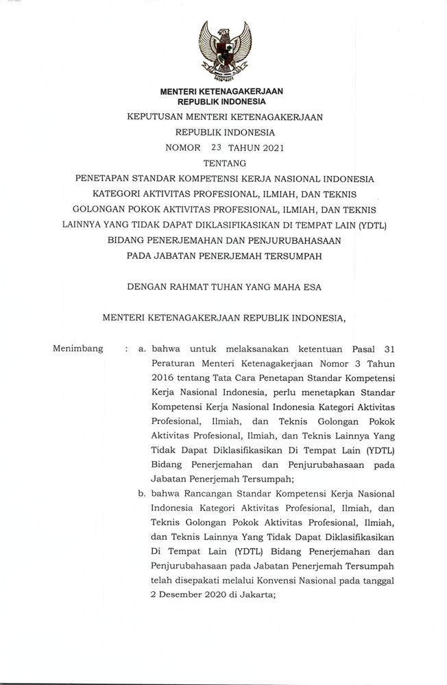 KEPUTUSAN MENTERI KETENAGAKERJAAN REPUBLIK INDONESIA NOMOR 23 TAHUN 2021