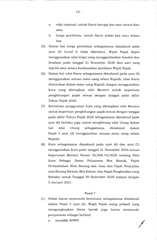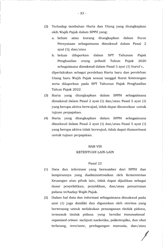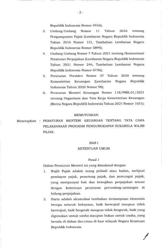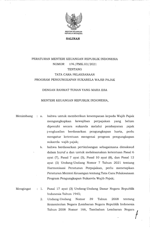 PERATURAN MENTRI KEUANGAN REPUBLIK INDONESIA NOMER 196/PMK 03/2021 TENTANG TATA CARA PELAKSANAAN PROGRAM PENGUNGKAPAN SUKARELA WAJIB PAJAK