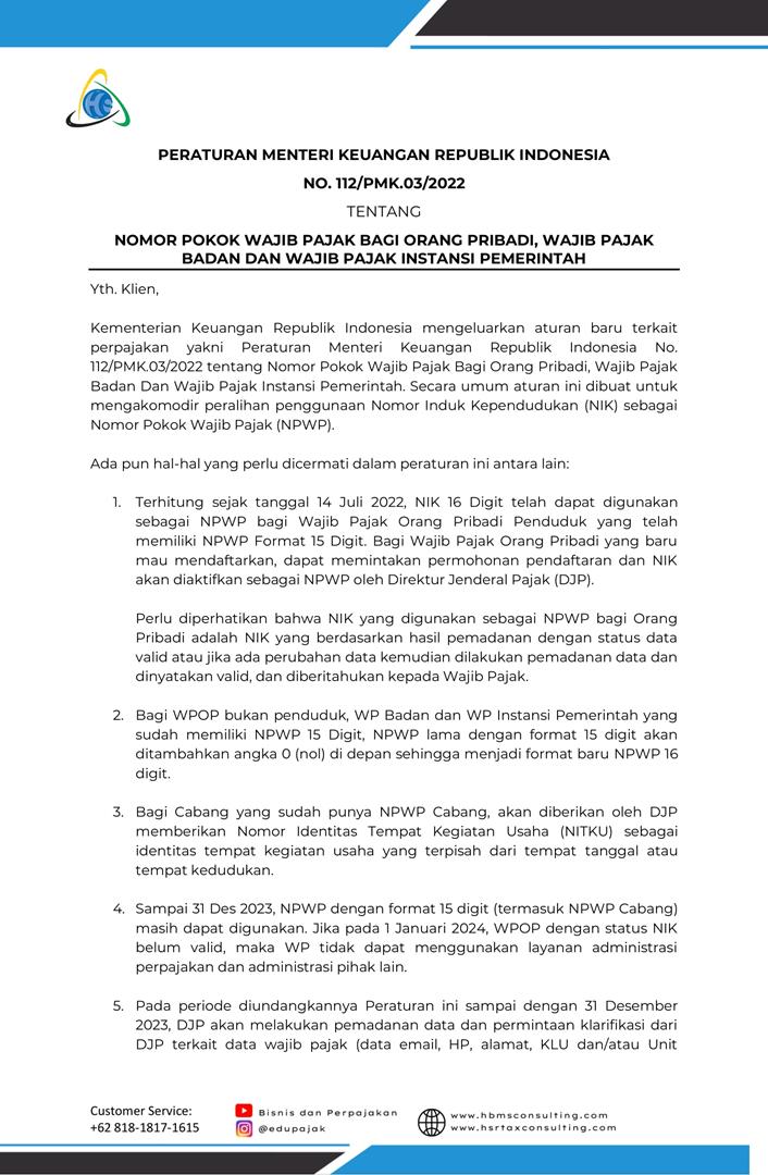 Summary PMK No 112 Tahun 2022 Tentang Nomor Pokok Wajib Pajak Bagi Wajib Pajak Orang Pribadi, Wajib Pajak Badan