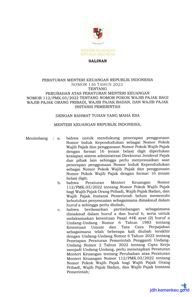 Peraturan Menteri Keuangan 136 Perubahan Atas Peraturan Menteri Keuangan No. 112/PMK .03/2022 Tentang NPWP OP , Badan & WP Instansi Pemerintah