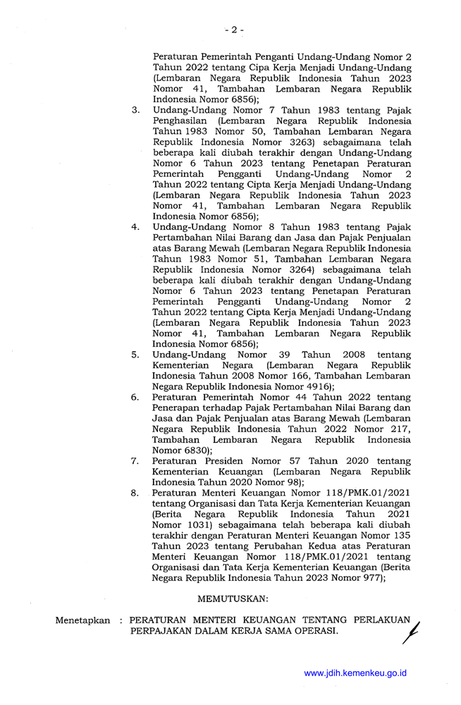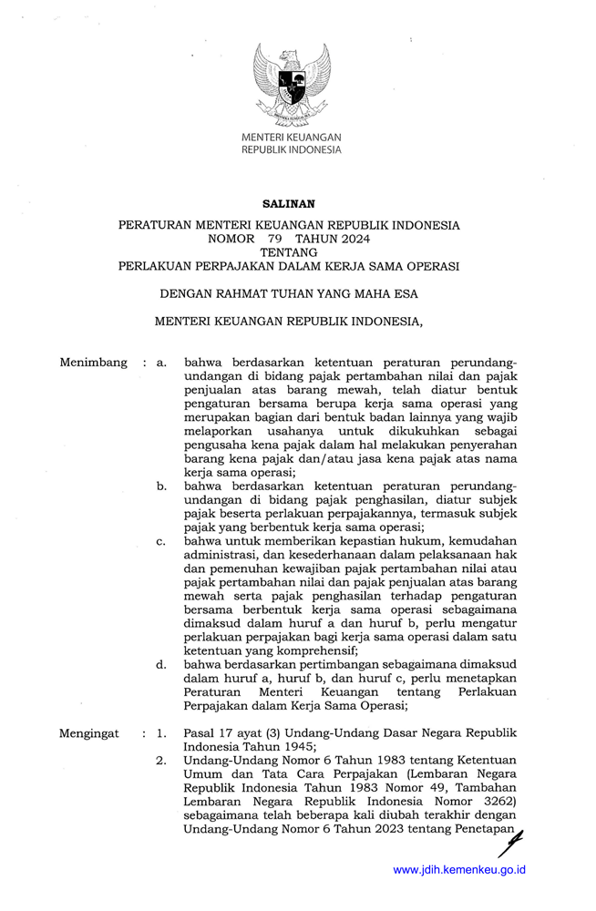 PMK 79 Tahun 2024 Tentang Perlakuan Perpajakan Dalam Kerja Sama Operasi