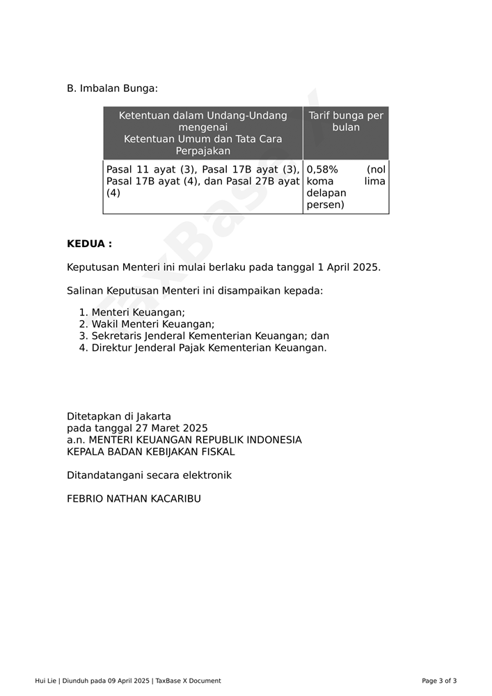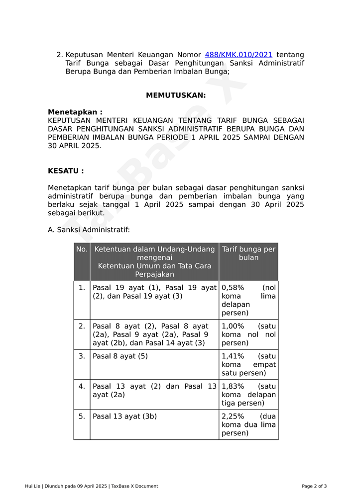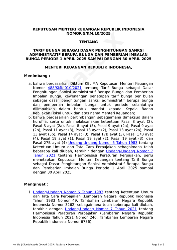 KMK 5 Tahun 2025 tentang Tarif Bunga Sebagai Dasar Penghitungan Sanksi Administratif Berupa Bunga dan Pemberian Imbalan Bunga Periode 1 April 2025 sampai dengan 30 April 2025