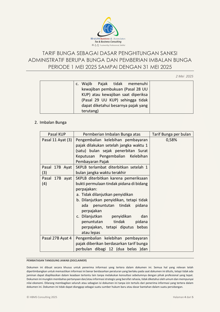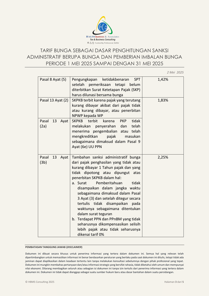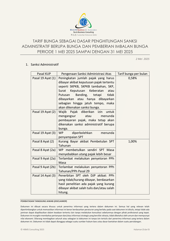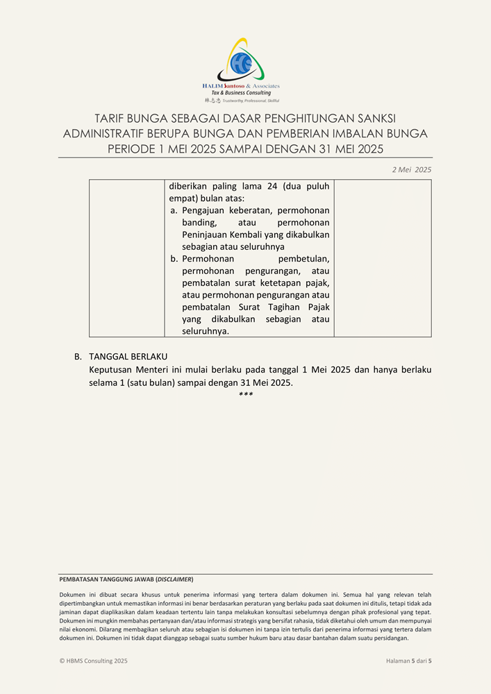 Summary - KMK/6/MK/KF/2025 tentang TARIF BUNGA SEBAGAI DASAR PENGHITUNGAN SANKSI ADMINISTRATIF BERUPA BUNGA DAN PEMBERIAN IMBALAN BUNGA PERIODE 1 MEI 2025 SAMPAI DENGAN 31 MEI 2025