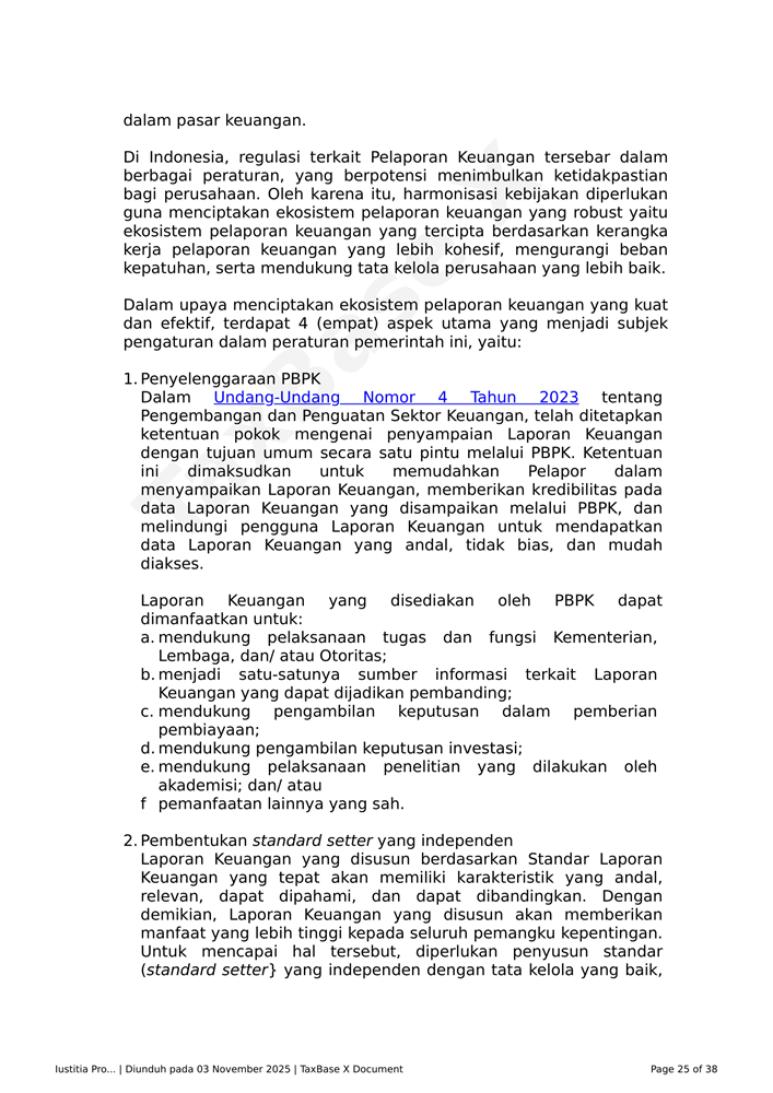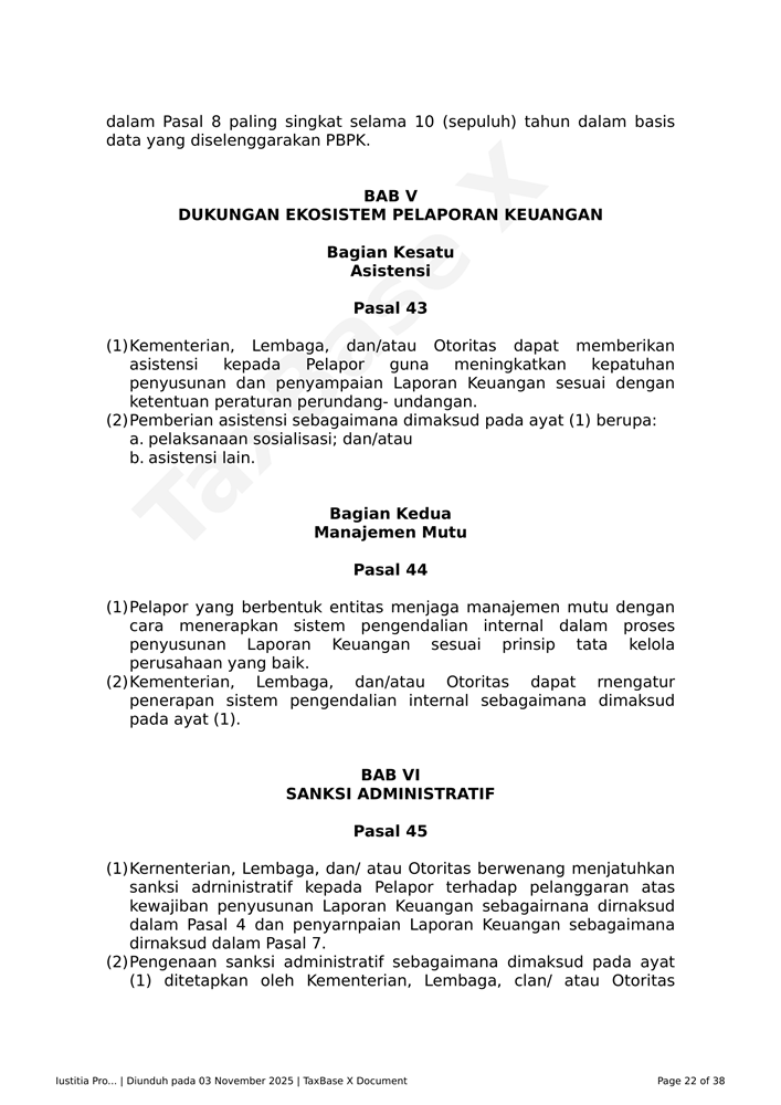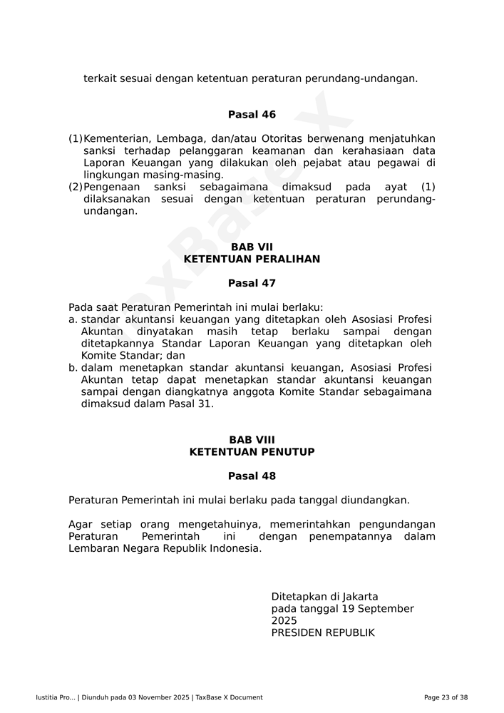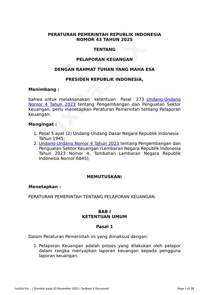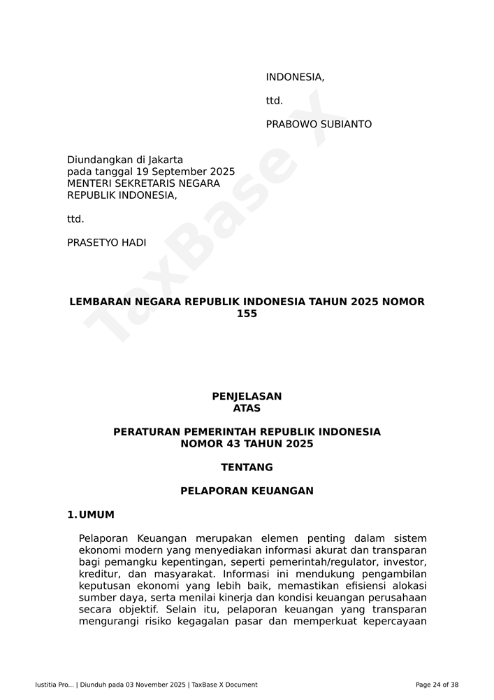 PP Nomor 43 Tahun 2025 Related Articles PP Nomor 43 Tahun 2025KMK – Nomor 8 MK EF 2025PMK Nomor 72 Tahun 2025 dan LampiranKMK REPUBLIK INDONESIA NOMOR 7/MK/EF/2025PERATURAN DIREKTUR JENDERAL PAJAK NOMOR PER - 18/PJ/2025KMK 5 Tahun 2025 tentang Tarif Bunga Sebagai Dasar Penghitungan Sanksi Administratif Berupa Bunga dan Pemberian Imbalan Bunga Periode 1 April 2025 sampai dengan 30 April 2025PMK 18 Tahun 2025 PPN DTP Jasa Angkutan Udara Niaga Berjadwal DN Kelas EkonomiKEP 67 PJ 2025 Kebijakan Penghapusan Sanksi Sehubungan Implementasi CoretaxPMK 119 Tahun 2024PENG-13 2025 Pembuatan Faktur Pajak Melalui Aplikasi E-Faktur Client DesktopPMK 118 Tahun 2024PMK 117 Tahun 2024PER-1 PJ 2025PMK 131 Tahun 2024PMK 79 Tahun 2024 tentang Perlakuan Perpajakan Dalam Kerja Sama OperasiPMK 78 Tahun 2024 tentang Ketentuan Pelaksanaan Bea MeteraiPMK 69 Tahun 2024 Perubahan Atas PMK Nomor 130/PMK.010/2020 Tentang Pemberian Fasilitas Pengurangan Pajak Penghasilan BadanLampiran PMK 74 Tahun 2024PMK 61 Tahun 2024POJK No. 11 Tahun 2024 Pelaporan dan Permintaan Informasi Debitur Melalui SLIKPMK 47 Tahun 2024 tentang Perubahan Ketiga PMK 70 PMK.03 2017 tentang Petunjuk Teknis mengenai Akses InformasiPP Nomor 22 Tahun 2024 Perlakuan PPh atas Penghasilan dari Penempatan Devisa Hasil Ekspor SDA pada Instrumen Moneter dan/atau Instrumen Keuangan Tertentu di IndonesiaSE-2 PJ 2024 PETUNJUK TEKNIS PELAKSANAAN PEMOTONGAN PAJAK PENGHASILAN ATAS DISKONTO SURAT BERHARGA YANG DITERBITKAN OLEH BANK INDONESIA DALAM RANGKA OPERASI MONETER YANG MEMILIKI KARAKTERISTIK SAMA DENGAN SERTIFIKAT BANK INDONESIAPERMENKOP UKM NOMOR 2 TAHUN 2024 KEBIJAKAN AKUNTANSI KOPERASIPMK 164 Tahun 2023 Tata Cara Pengenaan PPh atas Penghasilan dari Usaha yang Diterima atau Diperoleh WP yang Memiliki Peredaran Bruto Tertentu dan Kewajiban Pelaporan Usaha untuk Dikukuhkan sebagai PKP