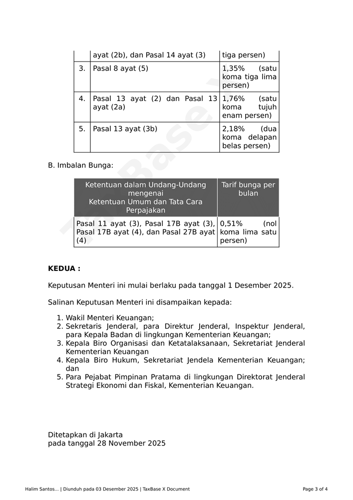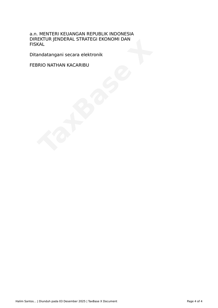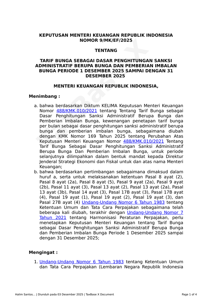 KMK – No. 9 MK EF 2025 Related Articles KMK – No. 9 MK EF 2025PP Nomor 43 Tahun 2025KMK – Nomor 8 MK EF 2025PMK Nomor 72 Tahun 2025 dan LampiranKMK REPUBLIK INDONESIA NOMOR 7/MK/EF/2025PERATURAN DIREKTUR JENDERAL PAJAK NOMOR PER - 18/PJ/2025KMK 5 Tahun 2025 tentang Tarif Bunga Sebagai Dasar Penghitungan Sanksi Administratif Berupa Bunga dan Pemberian Imbalan Bunga Periode 1 April 2025 sampai dengan 30 April 2025PMK 18 Tahun 2025 PPN DTP Jasa Angkutan Udara Niaga Berjadwal DN Kelas EkonomiKEP 67 PJ 2025 Kebijakan Penghapusan Sanksi Sehubungan Implementasi CoretaxPMK 119 Tahun 2024PENG-13 2025 Pembuatan Faktur Pajak Melalui Aplikasi E-Faktur Client DesktopPMK 118 Tahun 2024PMK 117 Tahun 2024PER-1 PJ 2025PMK 131 Tahun 2024PMK 79 Tahun 2024 tentang Perlakuan Perpajakan Dalam Kerja Sama OperasiPMK 78 Tahun 2024 tentang Ketentuan Pelaksanaan Bea MeteraiPMK 69 Tahun 2024 Perubahan Atas PMK Nomor 130/PMK.010/2020 Tentang Pemberian Fasilitas Pengurangan Pajak Penghasilan BadanLampiran PMK 74 Tahun 2024PMK 61 Tahun 2024POJK No. 11 Tahun 2024 Pelaporan dan Permintaan Informasi Debitur Melalui SLIKPMK 47 Tahun 2024 tentang Perubahan Ketiga PMK 70 PMK.03 2017 tentang Petunjuk Teknis mengenai Akses InformasiPP Nomor 22 Tahun 2024 Perlakuan PPh atas Penghasilan dari Penempatan Devisa Hasil Ekspor SDA pada Instrumen Moneter dan/atau Instrumen Keuangan Tertentu di IndonesiaSE-2 PJ 2024 PETUNJUK TEKNIS PELAKSANAAN PEMOTONGAN PAJAK PENGHASILAN ATAS DISKONTO SURAT BERHARGA YANG DITERBITKAN OLEH BANK INDONESIA DALAM RANGKA OPERASI MONETER YANG MEMILIKI KARAKTERISTIK SAMA DENGAN SERTIFIKAT BANK INDONESIAPERMENKOP UKM NOMOR 2 TAHUN 2024 KEBIJAKAN AKUNTANSI KOPERASI